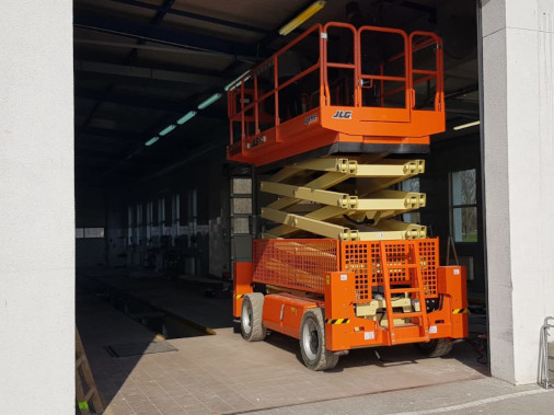 Podest nożycowy elektryczny JLG 4069LE. Podnośnik nożycowy zapewniający 14,19 m wysokości roboczej, przeznaczony jest do pracy 2 osób wewnątrz i na zewnątrz.
